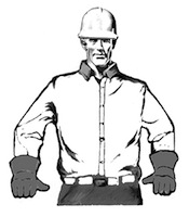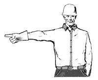 1. What action does a signal person intend the operator to perform if he extends his arm at shoulder height, makes a fist with his hand, and sticks his thumb up?